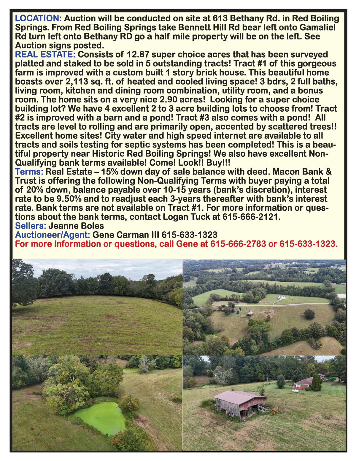 REAL ESTATE: Consists of 12.87 super choice acres that has been surveyed platted and staked to be sold in 5 outstanding tracts! Tract #1 of this gorgeous farm is improved with a custom built 1 story brick house. This beautiful home boasts over 2,113 sq. ft. of heated and cooled living space! 3 bdrs, 2 full baths, living room, kitchen and dining room combination, utility room, and a bonus room. The home sits on a very nice 2.90 acres! Looking for a super choice building lot? We have 4 excellent 2 to 3 acre building lots to choose from! Tract #2 is improved with a barn and a pond! Tract #3 also comes with a pond! All tracts are level to rolling and are primarily open, accented by scattered trees!! Excellent home sites! City water and high speed internet are available to all tracts and soils testing for septic systems has been completed! This is a beautiful property near Historic Red Boiling Springs! We also have excellent Non-Qualifying bank terms available! Come! Look!! Buy!!!