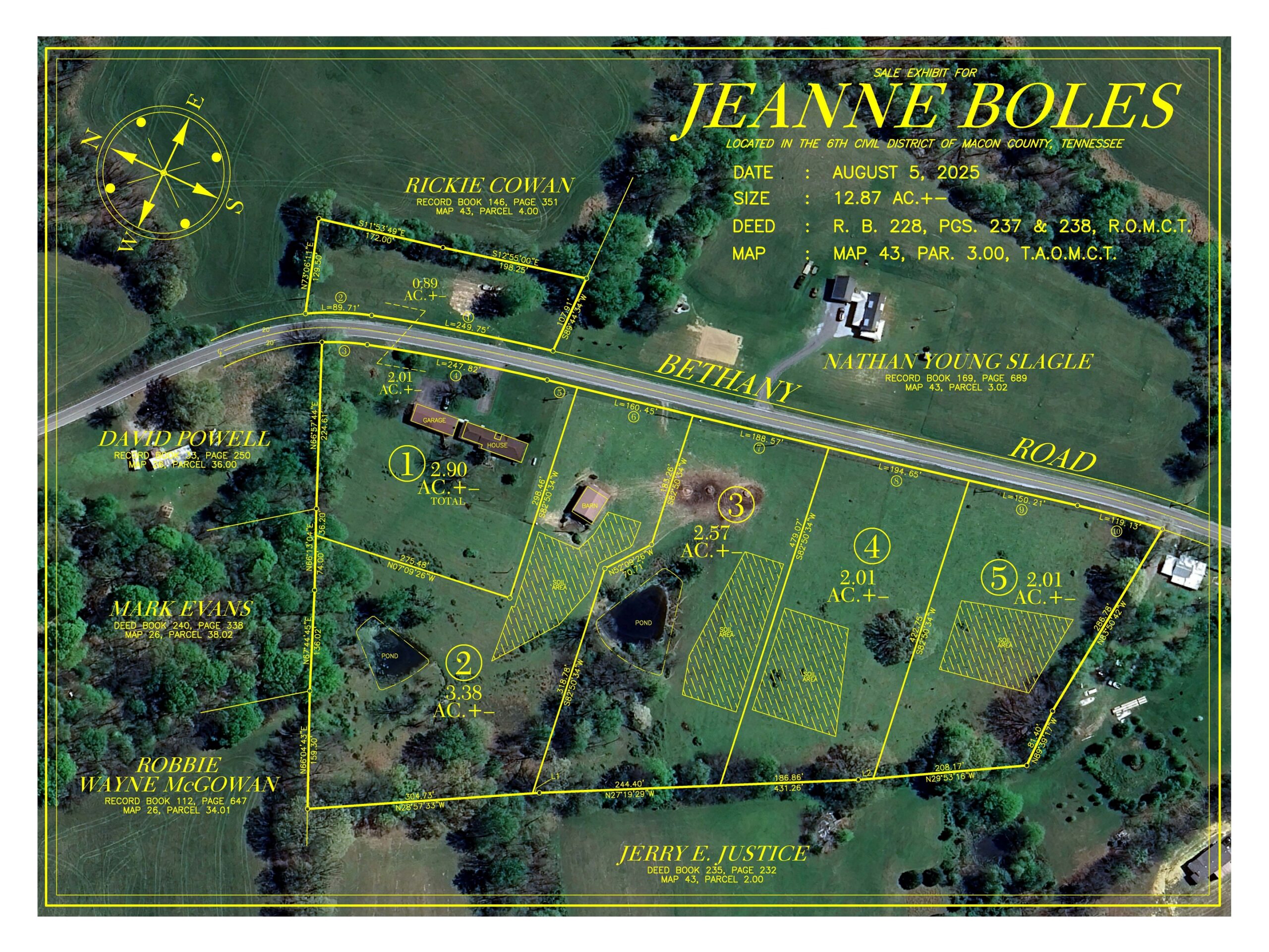 Terms: Real Estate – 15% down day of sale balance with deed. Macon Bank & Trust is offering the following Non-Qualifying Terms with buyer paying a total of 20% down, balance payable over 10-15 years (bank’s discretion), interest rate to be 9.50% and to readjust each 3-years thereafter with bank’s interest rate. Bank terms are not available on Tract #1. For more information or questions about the bank terms, contact Logan Tuck at 615-666-2121.