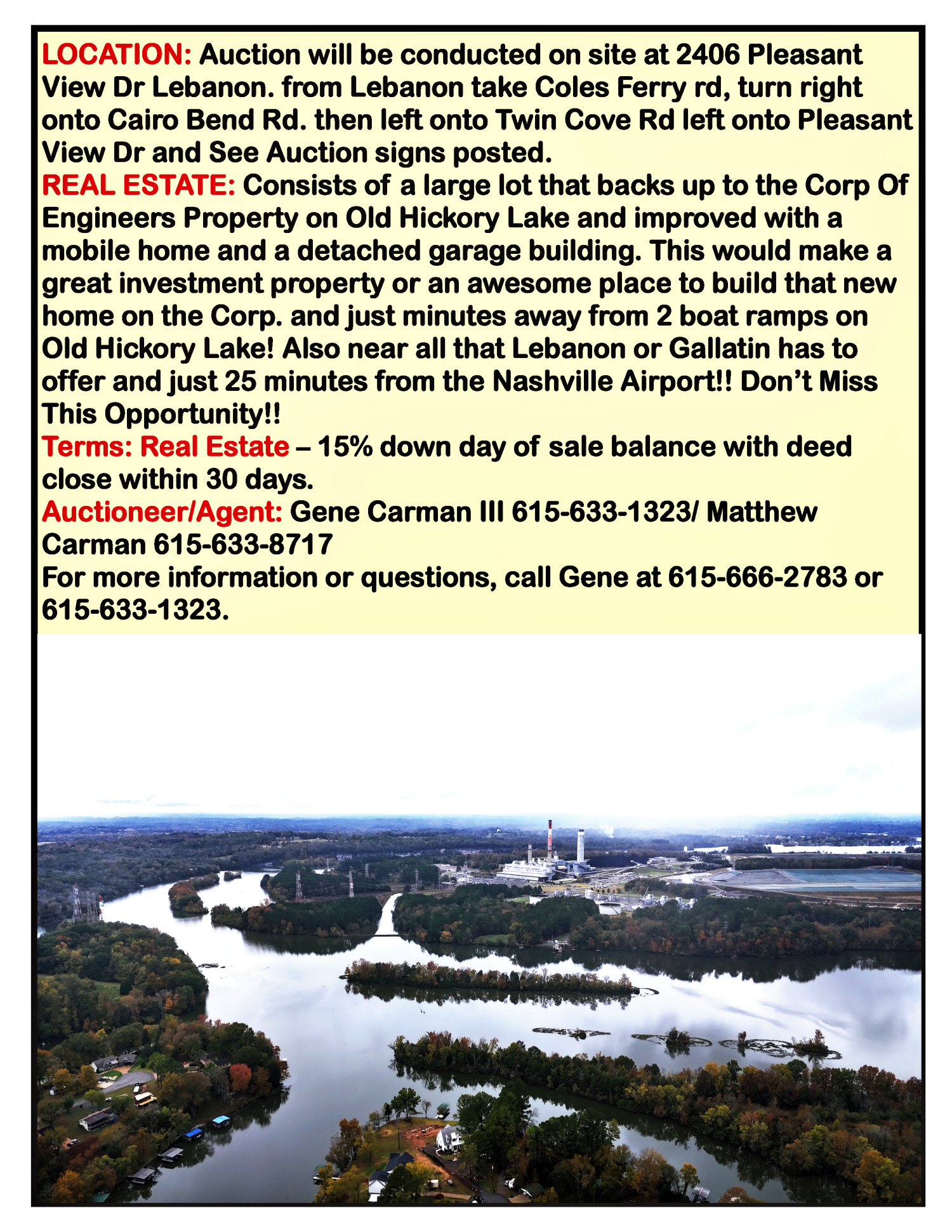 LOCATION: Auction will be conducted on site at 2406 Pleasant View Dr Lebanon. from Lebanon take Coles Ferry rd, turn right onto Cairo Bend Rd. then left onto Twin Cove Rd left onto Pleasant View Dr and See Auction signs posted.