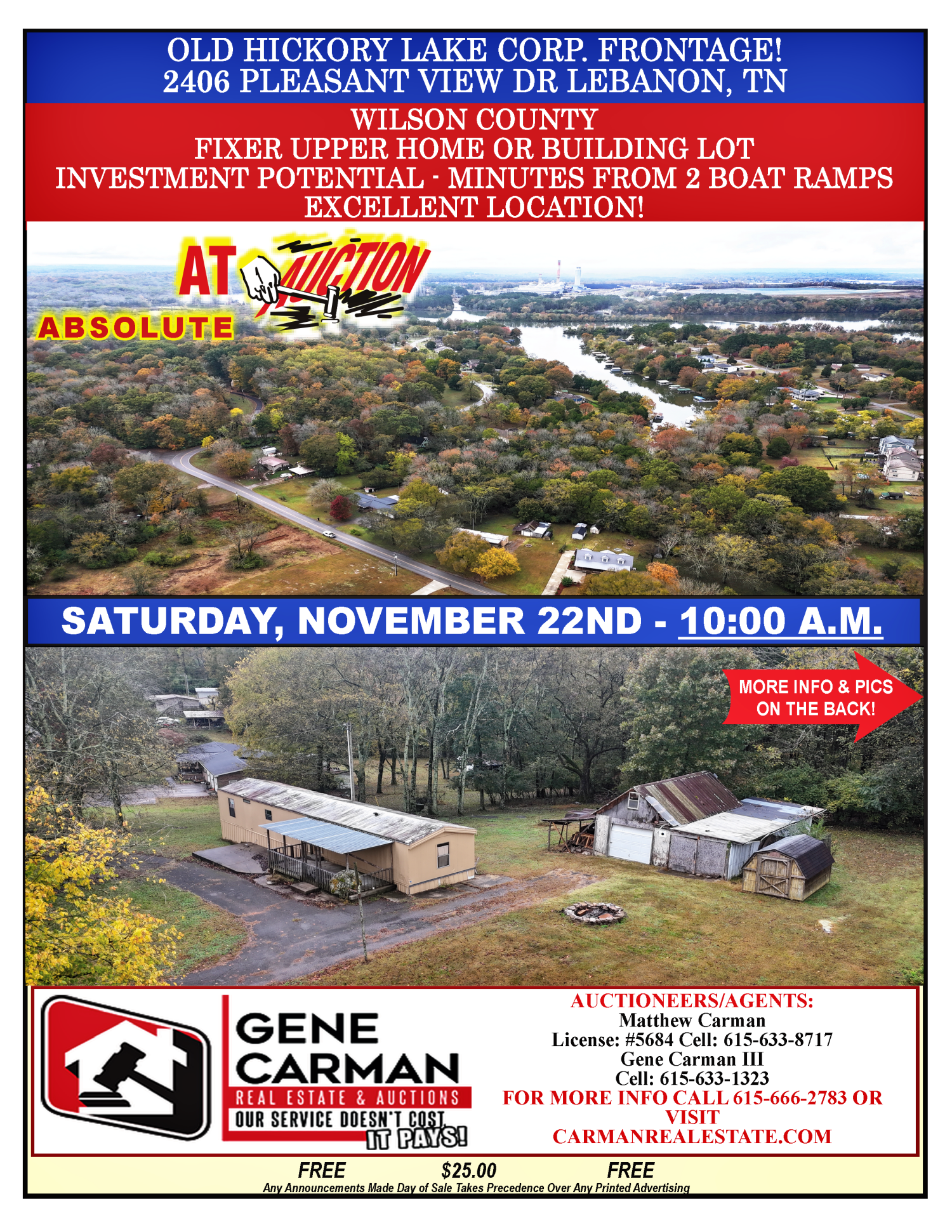 Auctioneer/Agent: Gene Carman III 615-633-1323/ Matthew Carman 615-633-8717