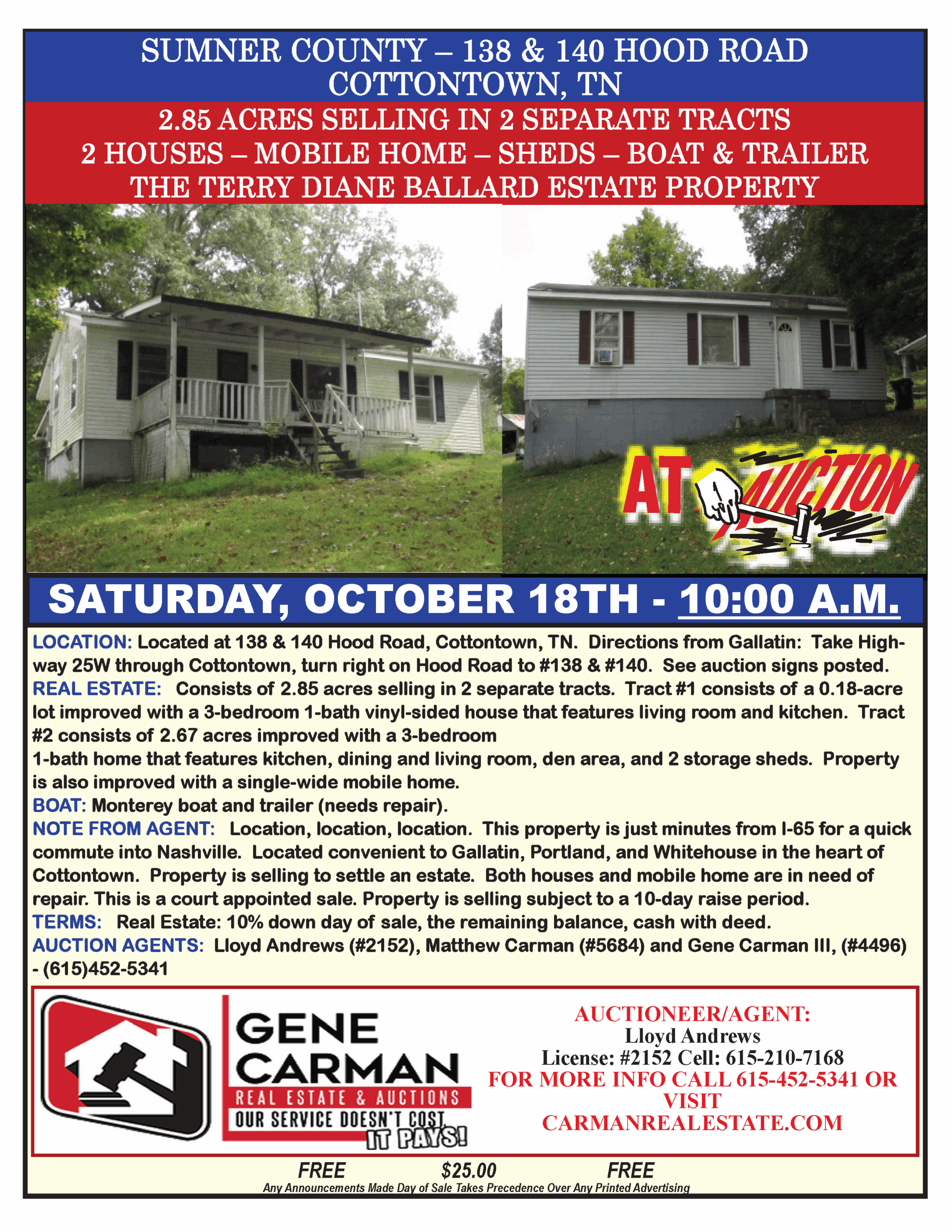 LOCATION: Located at 138 & 140 Hood Road, Cottontown, TN. Directions from Gallatin: Take Highway 25W through Cottontown, turn right on Hood Road to #138 & #140. See auction signs posted.