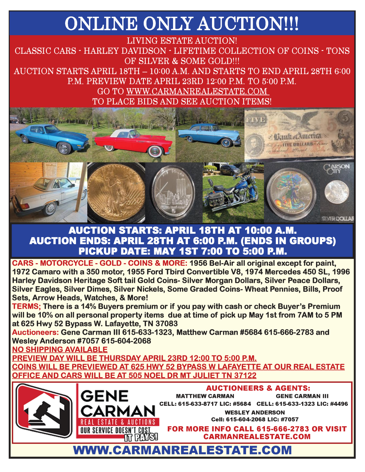 Auctioneers: Gene Carman III 615-633-1323, Matthew Carman #5684 615-666-2783 and Wesley Anderson #7057 615-604-2068