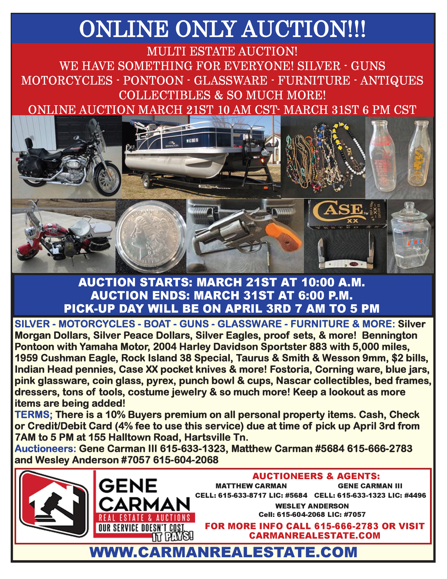 Auctioneers: Gene Carman III 615-633-1323, Matthew Carman #5684 615-666-2783 and Wesley Anderson #7057 615-604-2068