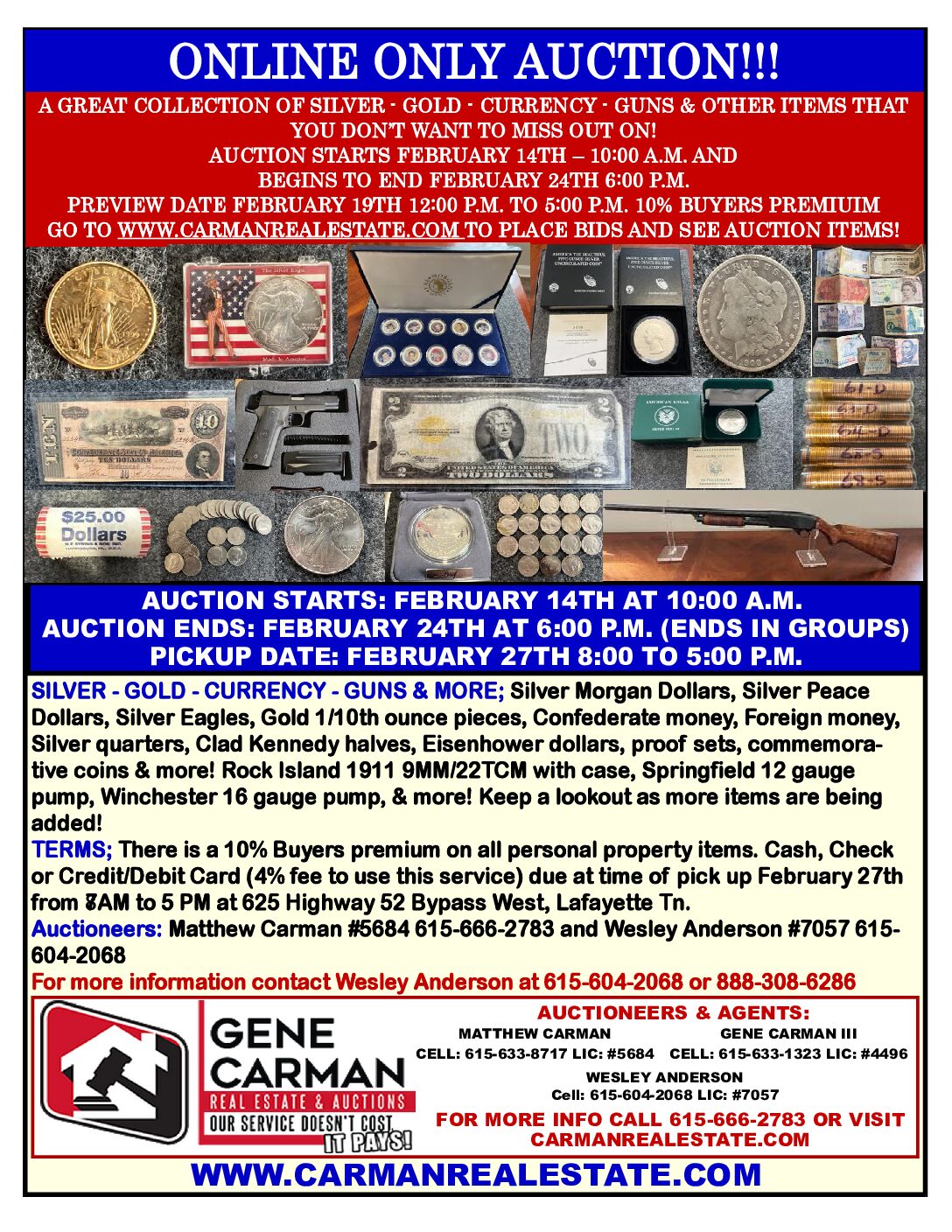 Auctioneers: Matthew Carman #5684 615-666-2783 and Wesley Anderson #7057 615-604-2068