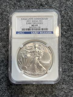 SILVER – GOLD – CURRENCY – GUNS & MORE; Silver Morgan Dollars, Silver Peace Dollars, Silver Eagles, Gold 1/10th ounce pieces, Confederate money, Foreign money, Silver quarters, Clad Kennedy halves, Eisenhower dollars, proof sets, commemorative coins & more! Rock Island 1911 9MM/22TCM with case, Springfield 12 gauge pump, Winchester 16 gauge pump, & more! Keep a lookout as more items are being added!